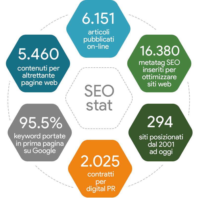 A 20 anni dai primi passi nel marketing digitale, siamo fieri di poter esporre una percentuale prossima al 95.5% di successo nel raggiungimento della prima pagina su Google per le keyword strategiche per i nostri Clienti.